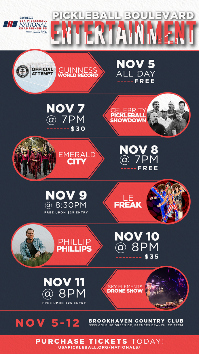 Come join us on the Pickleball Boulevard for fun and entertainment for the whole family! Catch a concert, comedy show, celebrity pickleball match, drone show, and food trucks galore!